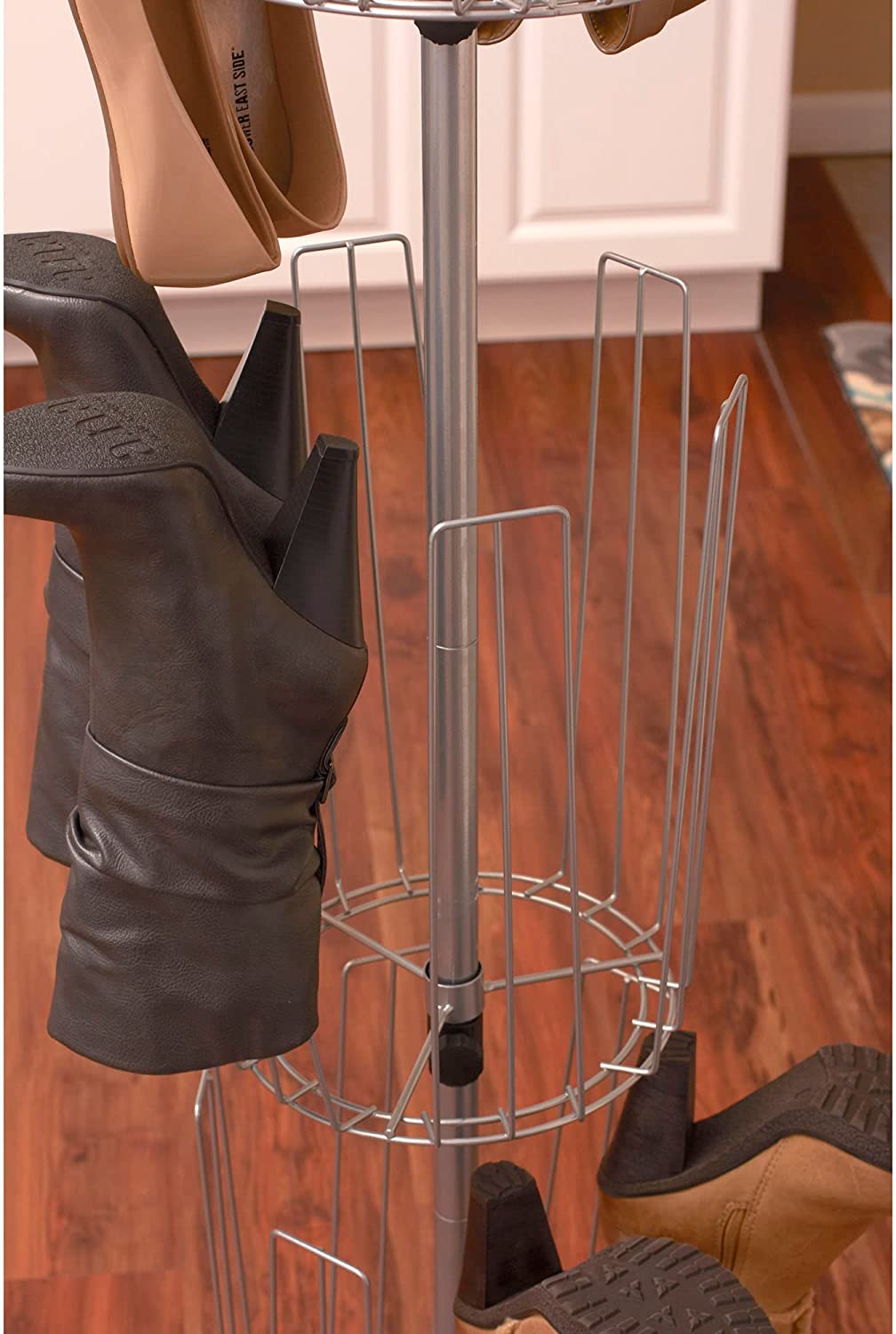 - Three-tier boot and shoe storage organizer with rotating carousels for closet and entryway
